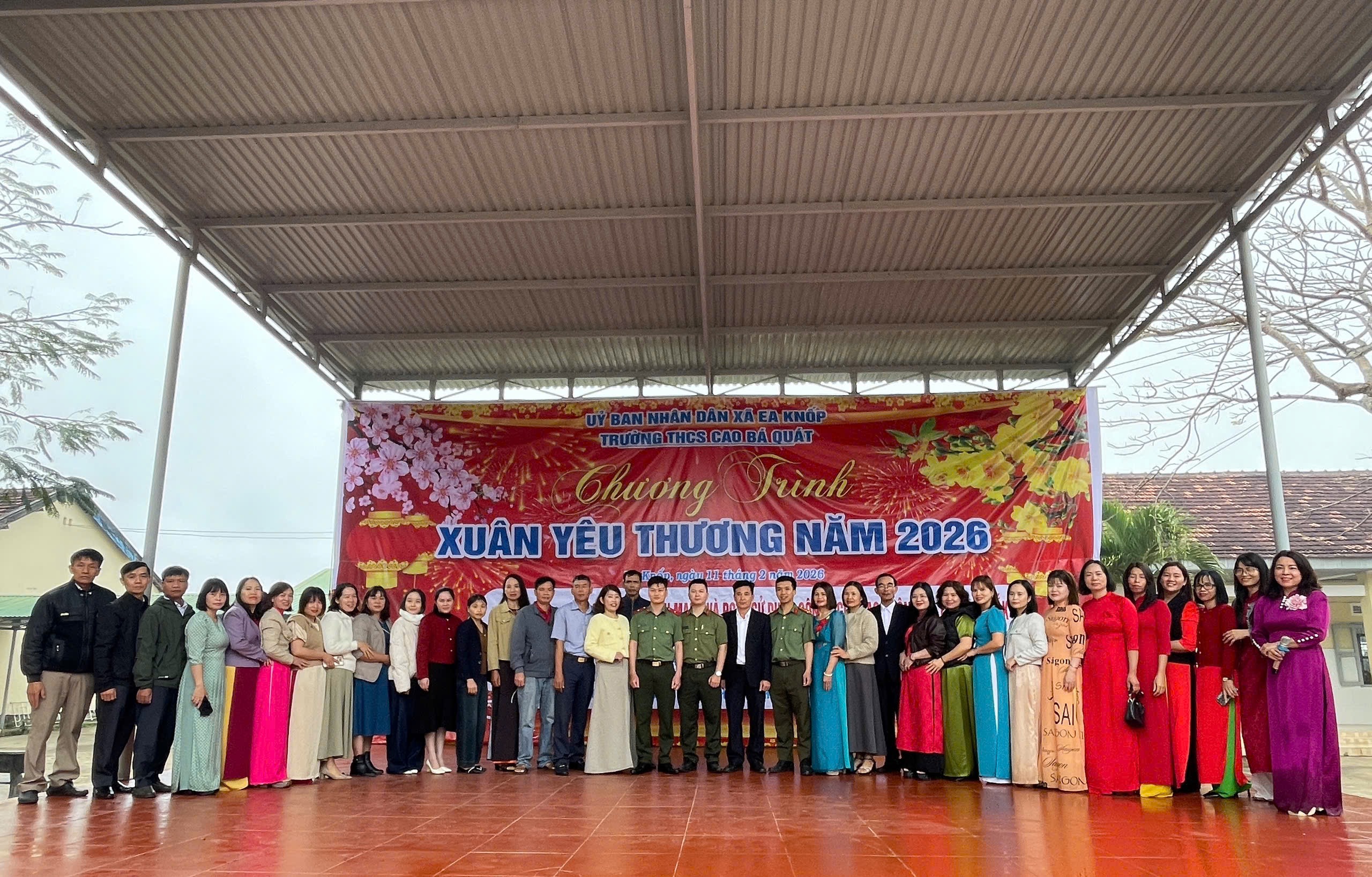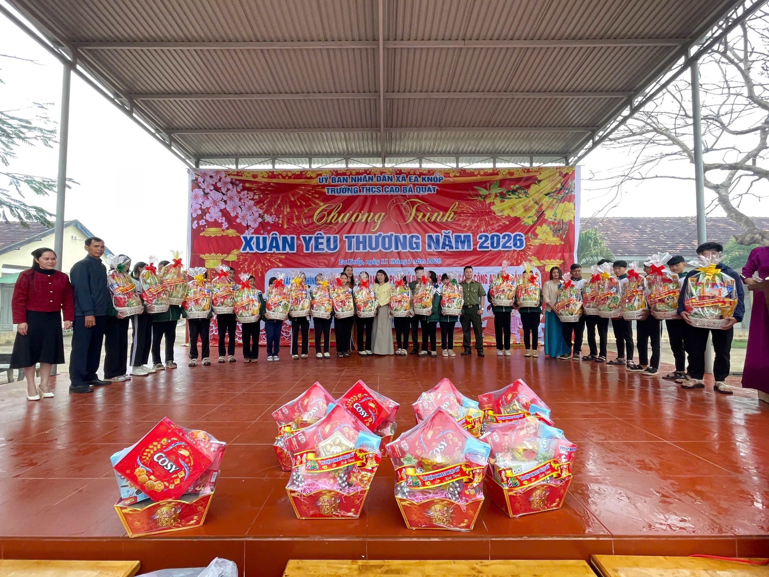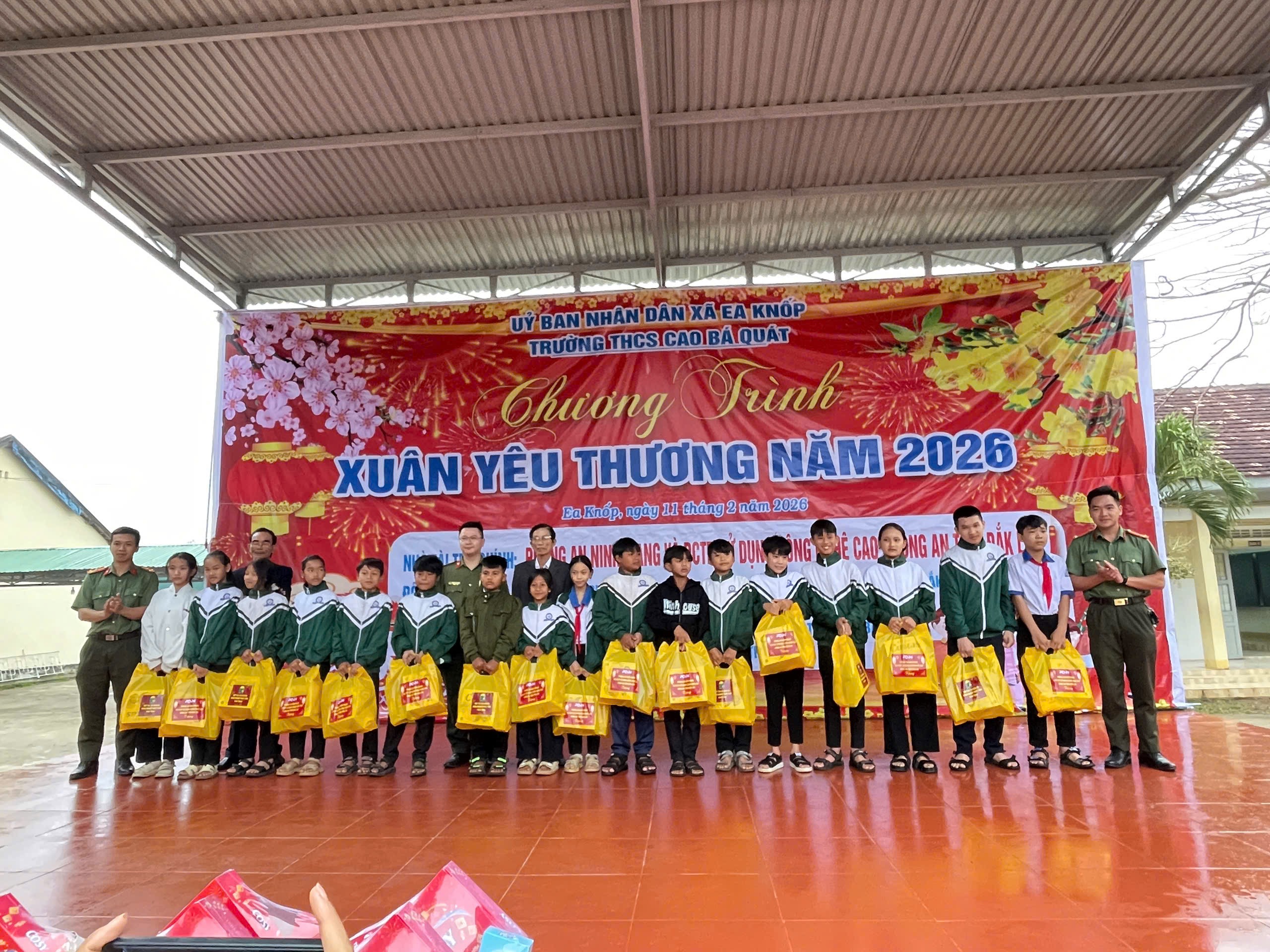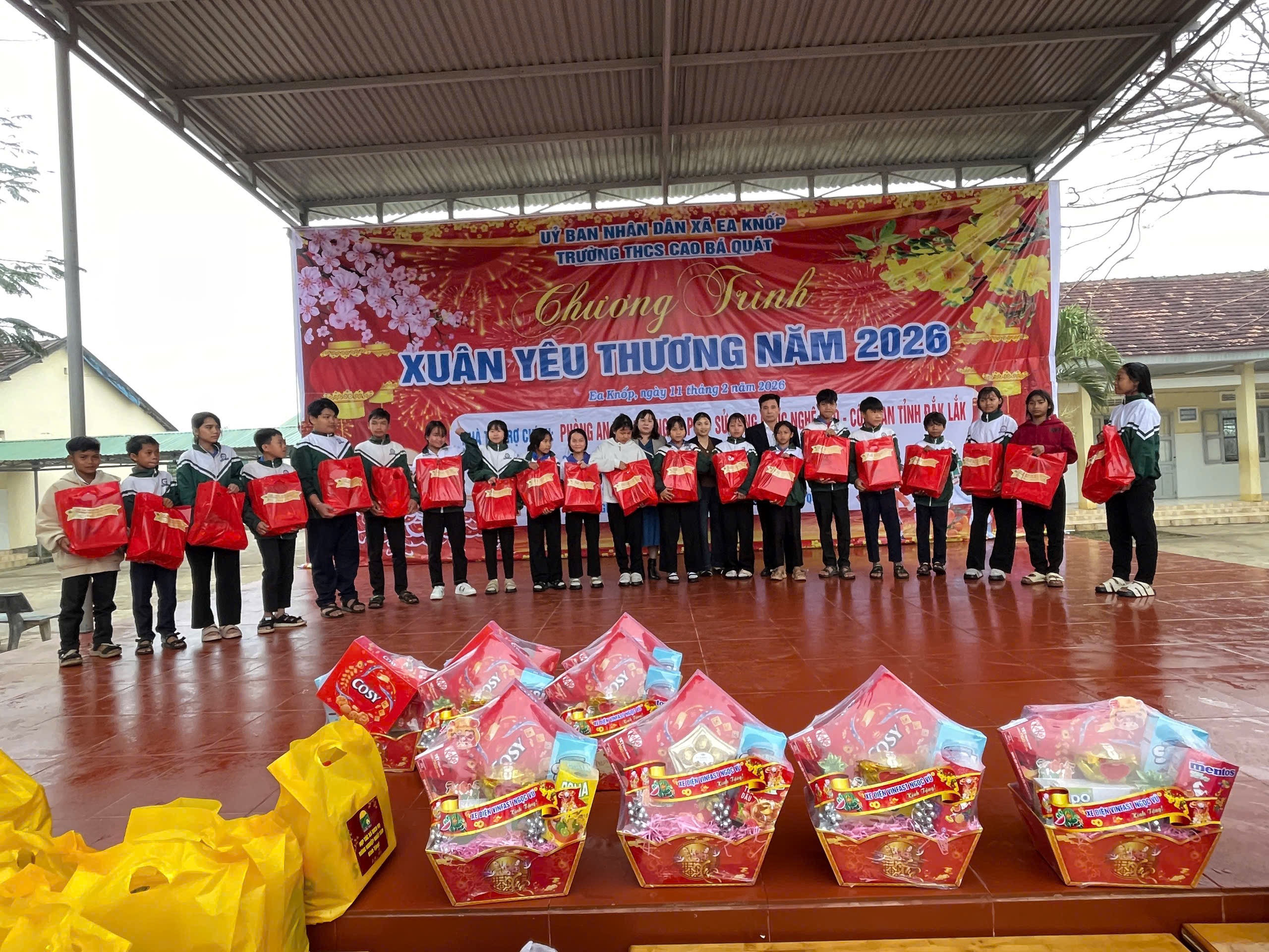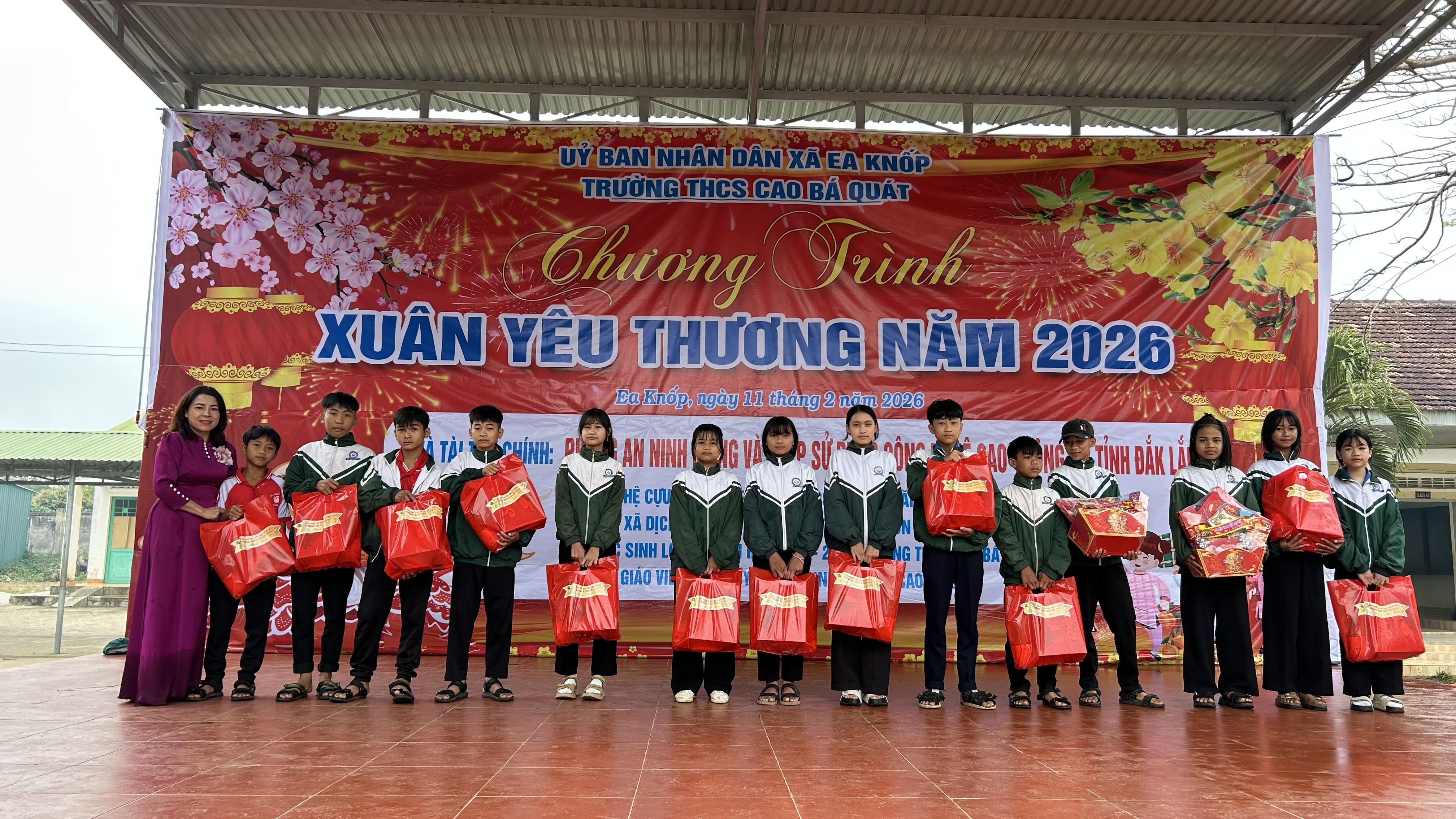 Sáng ngày 11/02/2026, trong tiết trời mưa nhẹ đầu xuân, Trường THCS Cao Bá Quát (xã Ea Knốp, tỉnh Đắk Lắk) đã tổ chức chương trình “Xuân Yêu Thương 2026” nhằm trao tặng quà Tết cho học sinh có hoàn cảnh khó khăn của nhà trường. Dù thời tiết không thuận lợi, nhưng không khí buổi lễ vẫn ấm áp, chan chứa nghĩa tình và sự sẻ chia.