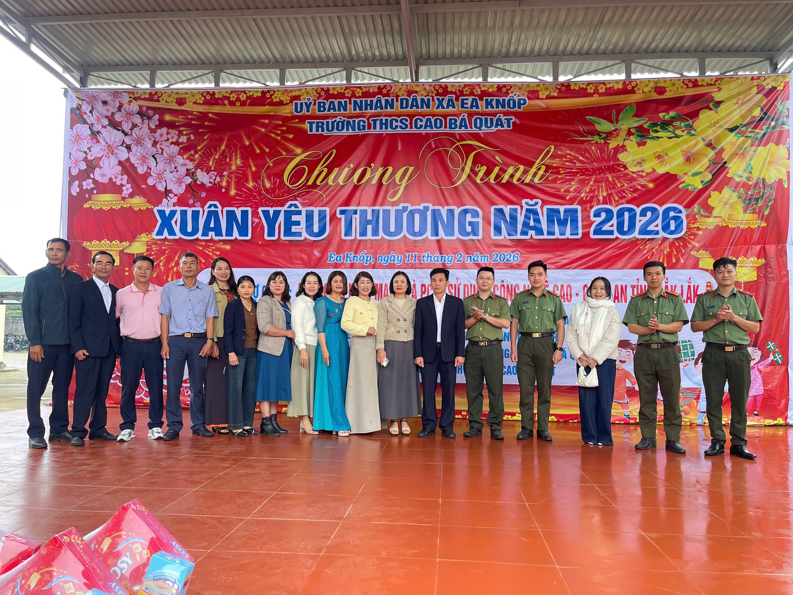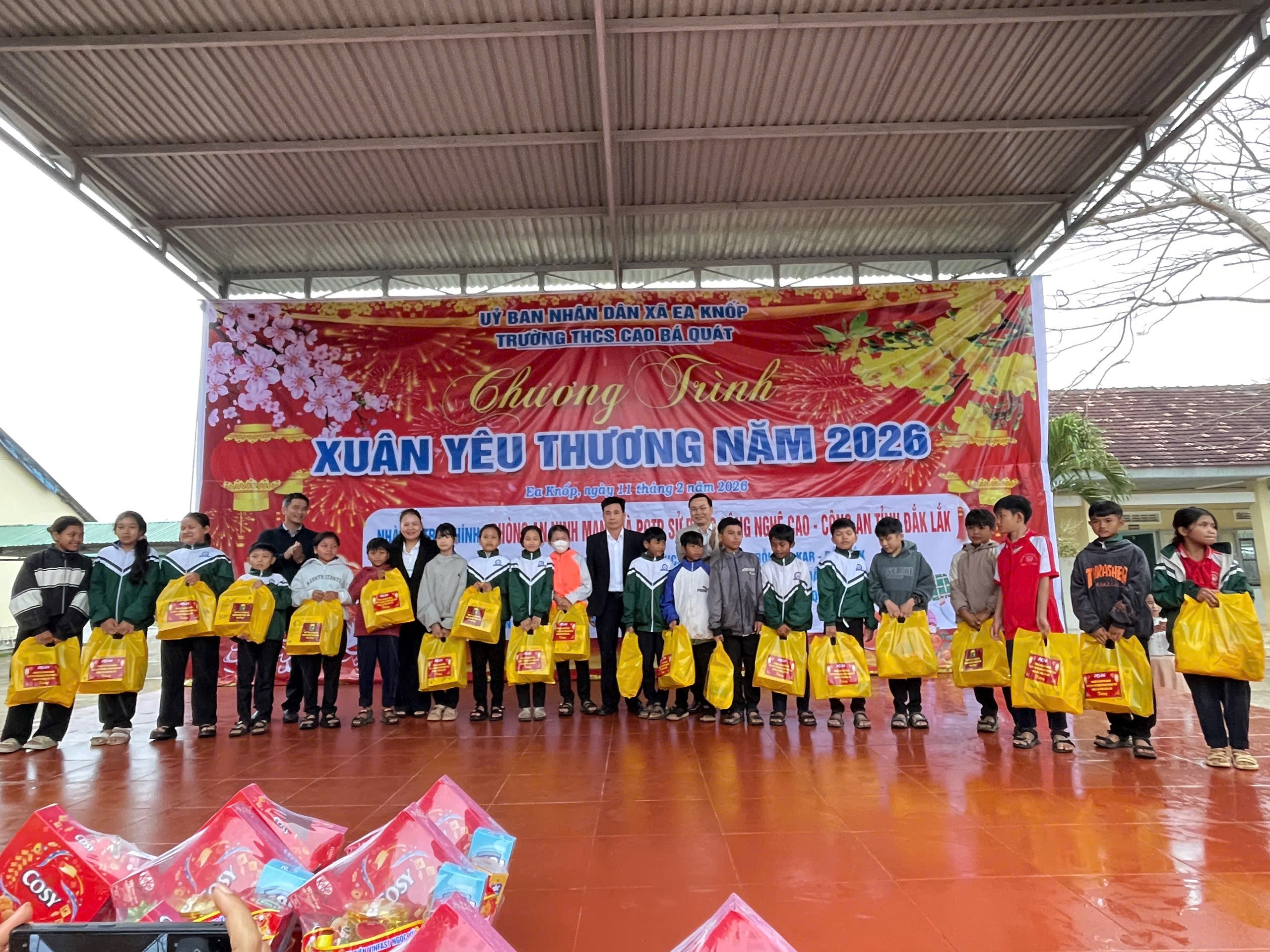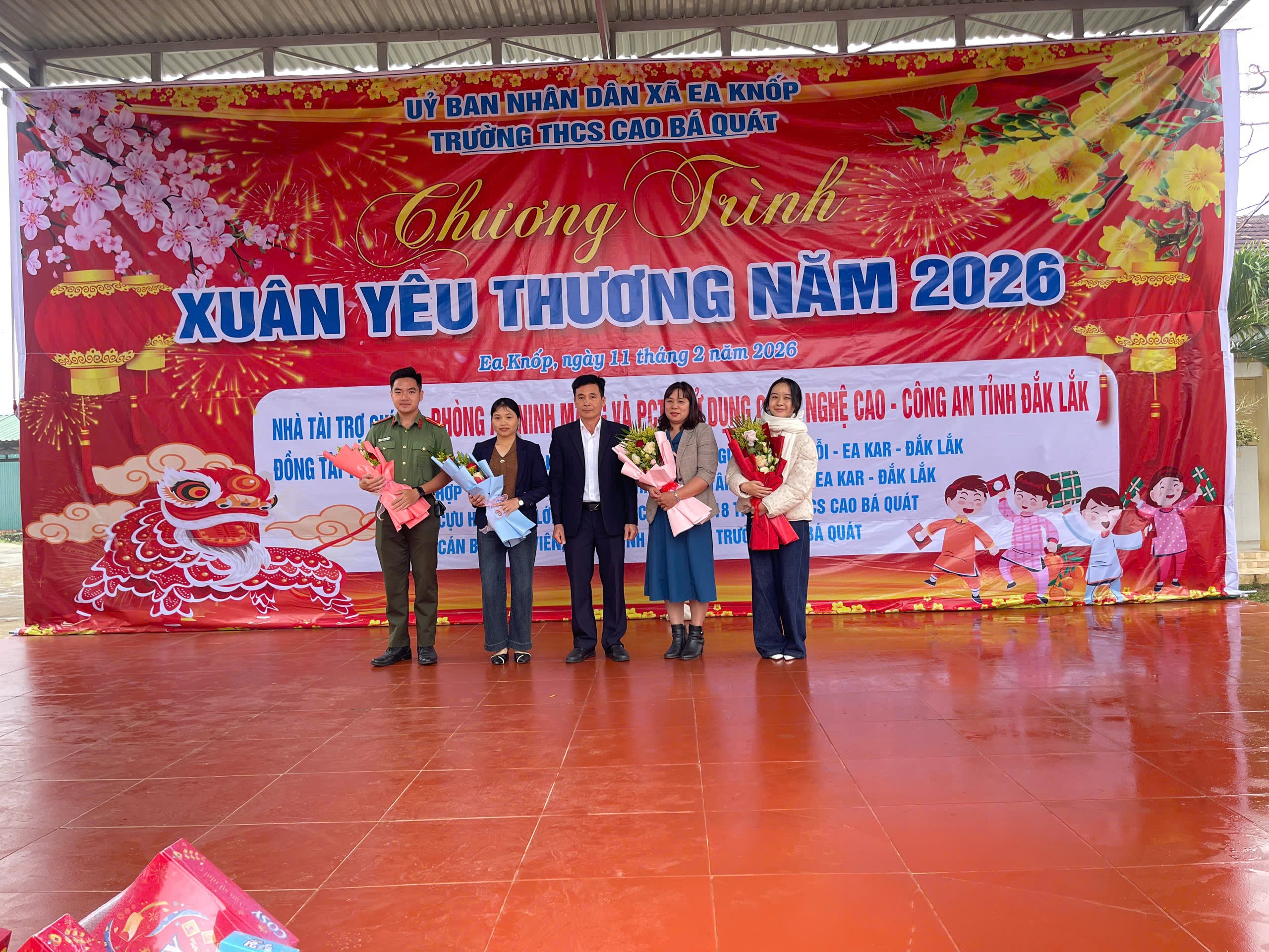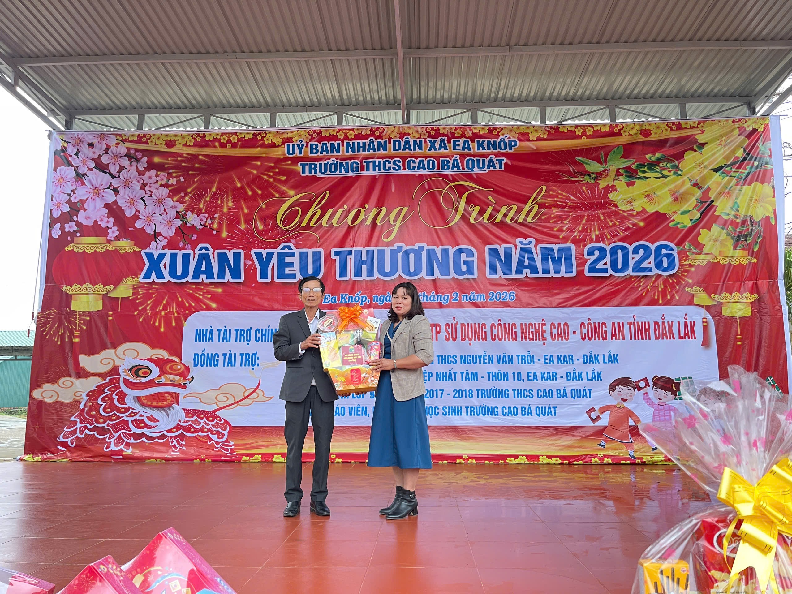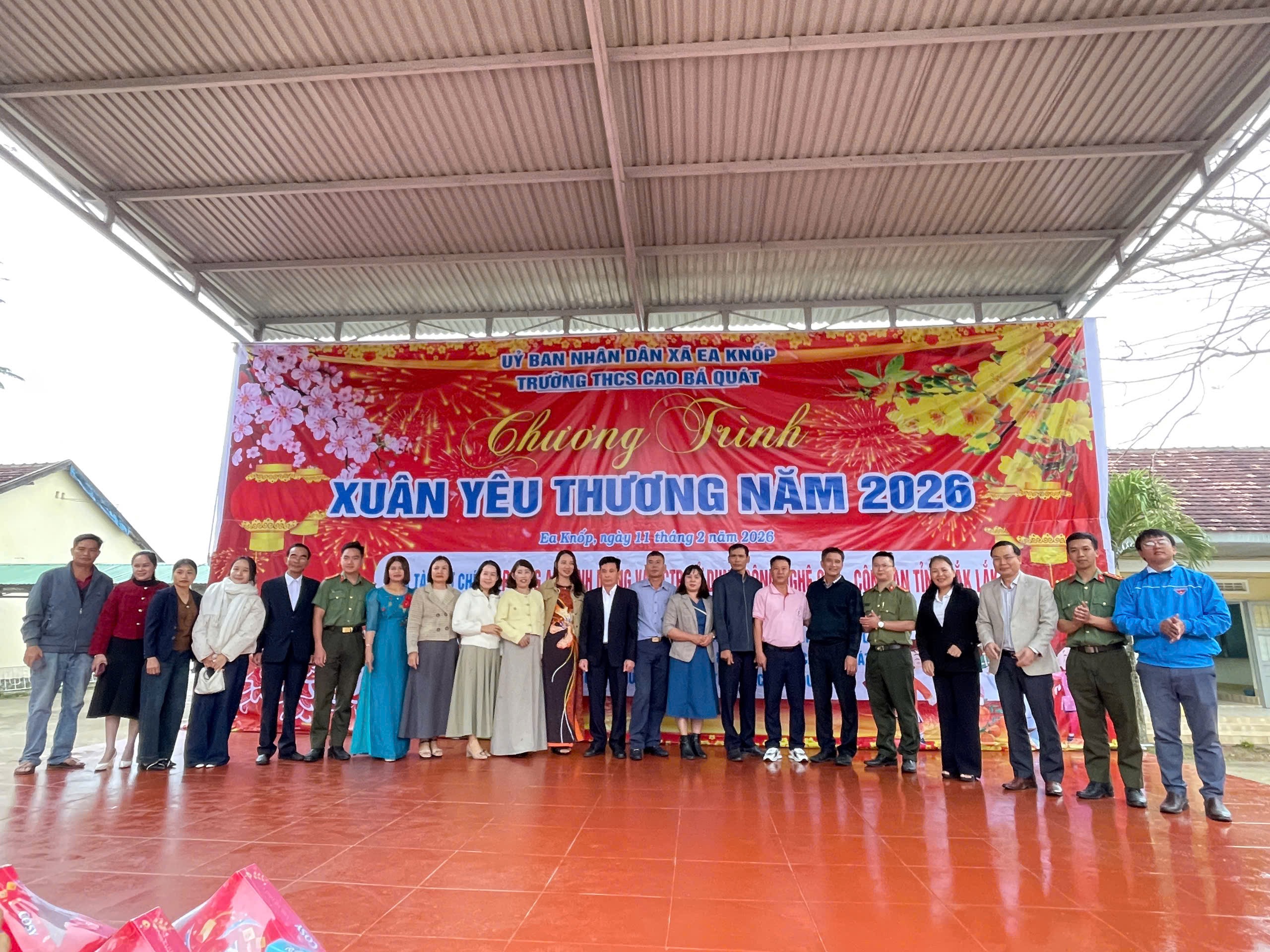 Sáng ngày 11/02/2026, trong tiết trời mưa nhẹ đầu xuân, Trường THCS Cao Bá Quát (xã Ea Knốp, tỉnh Đắk Lắk) đã tổ chức chương trình “Xuân Yêu Thương 2026” nhằm trao tặng quà Tết cho học sinh có hoàn cảnh khó khăn của nhà trường. Dù thời tiết không thuận lợi, nhưng không khí buổi lễ vẫn ấm áp, chan chứa nghĩa tình và sự sẻ chia.