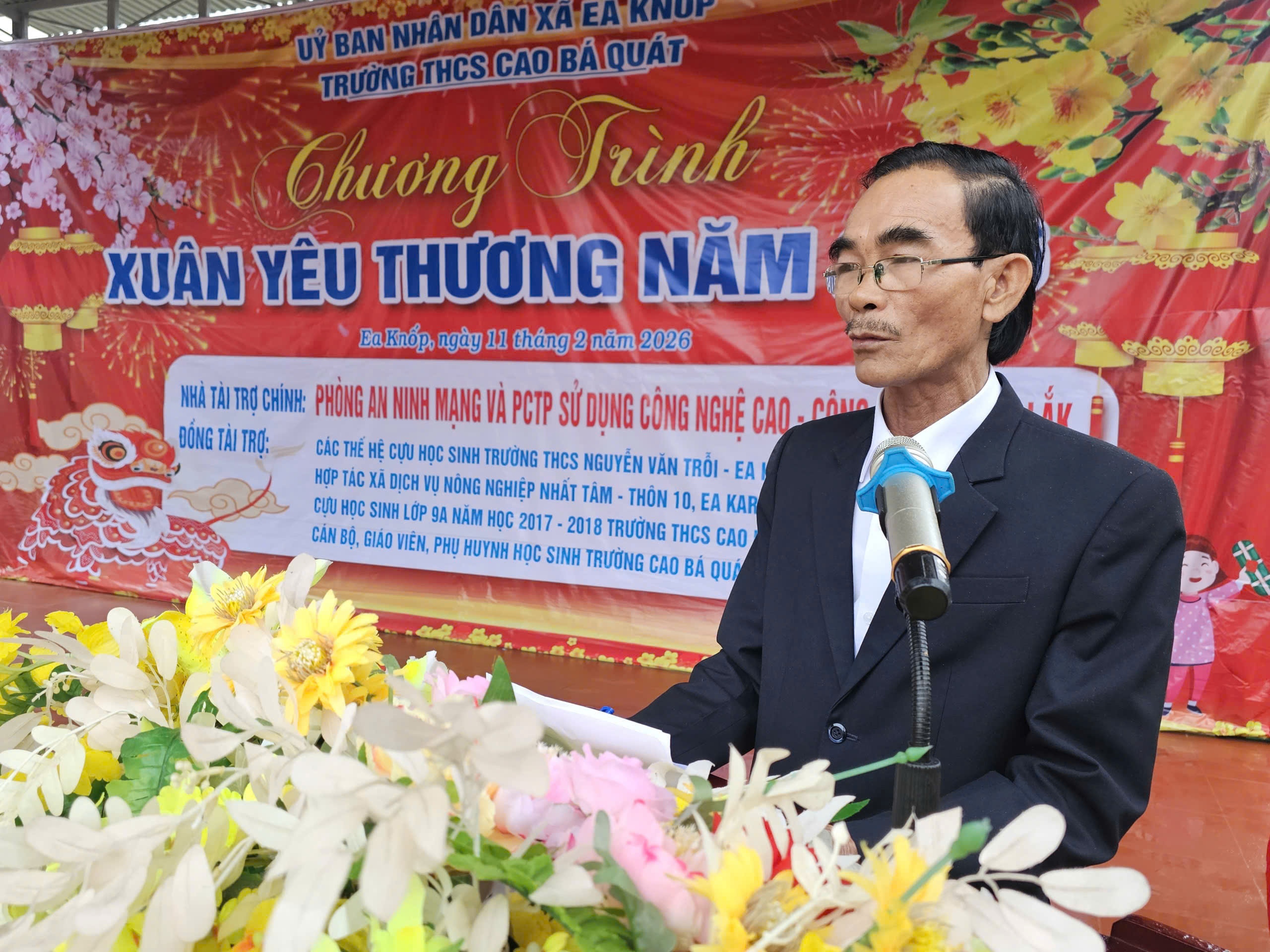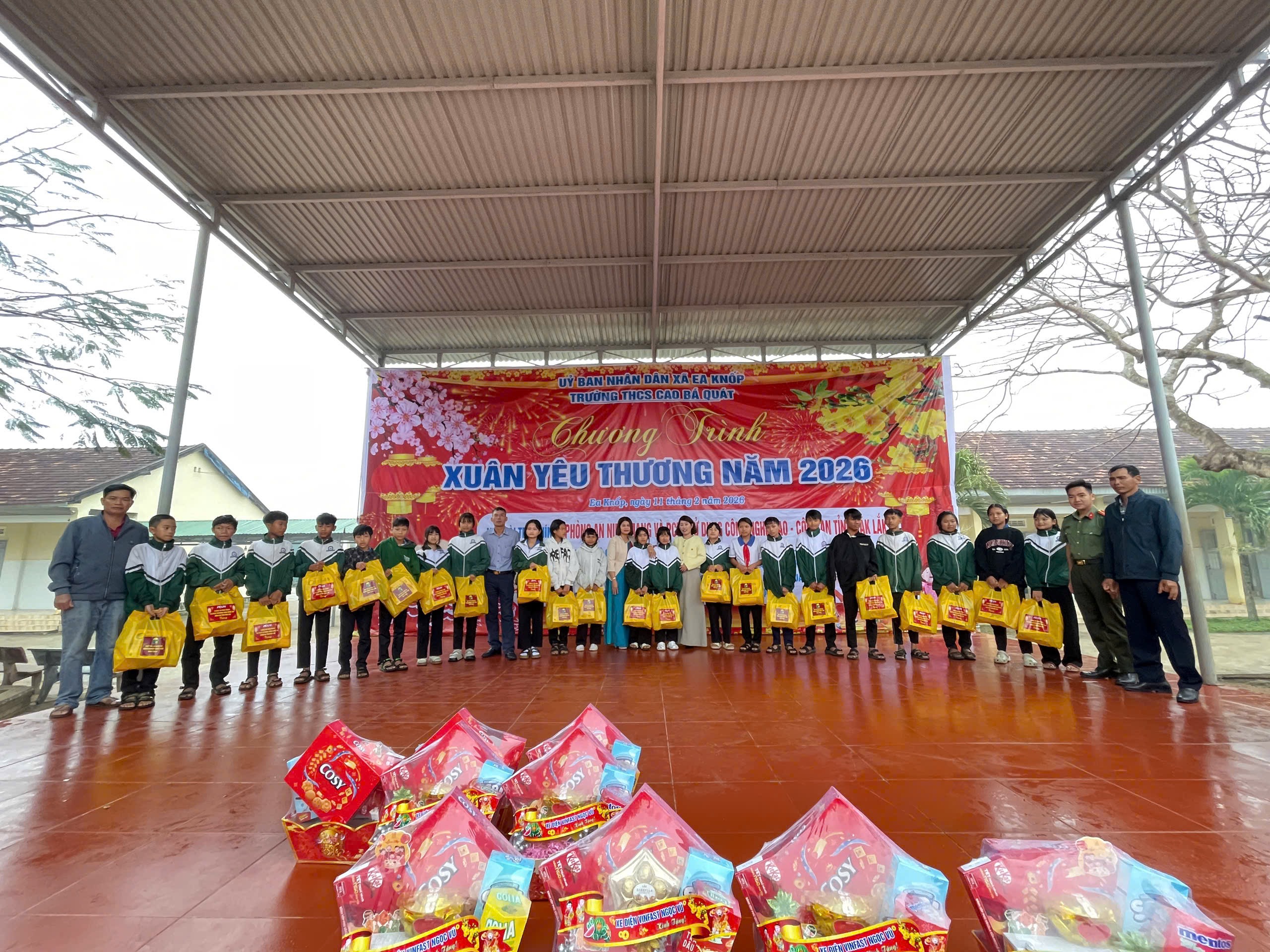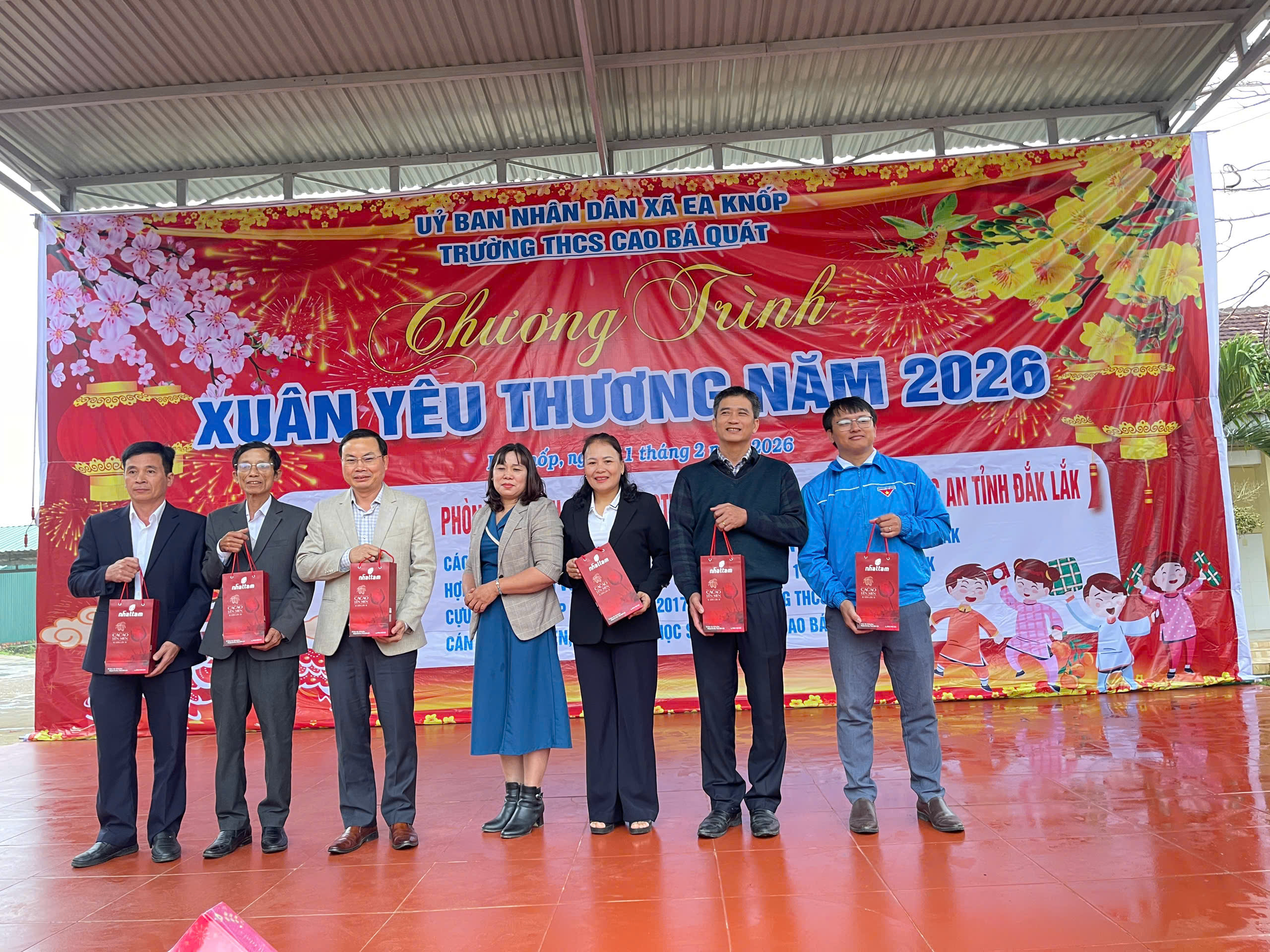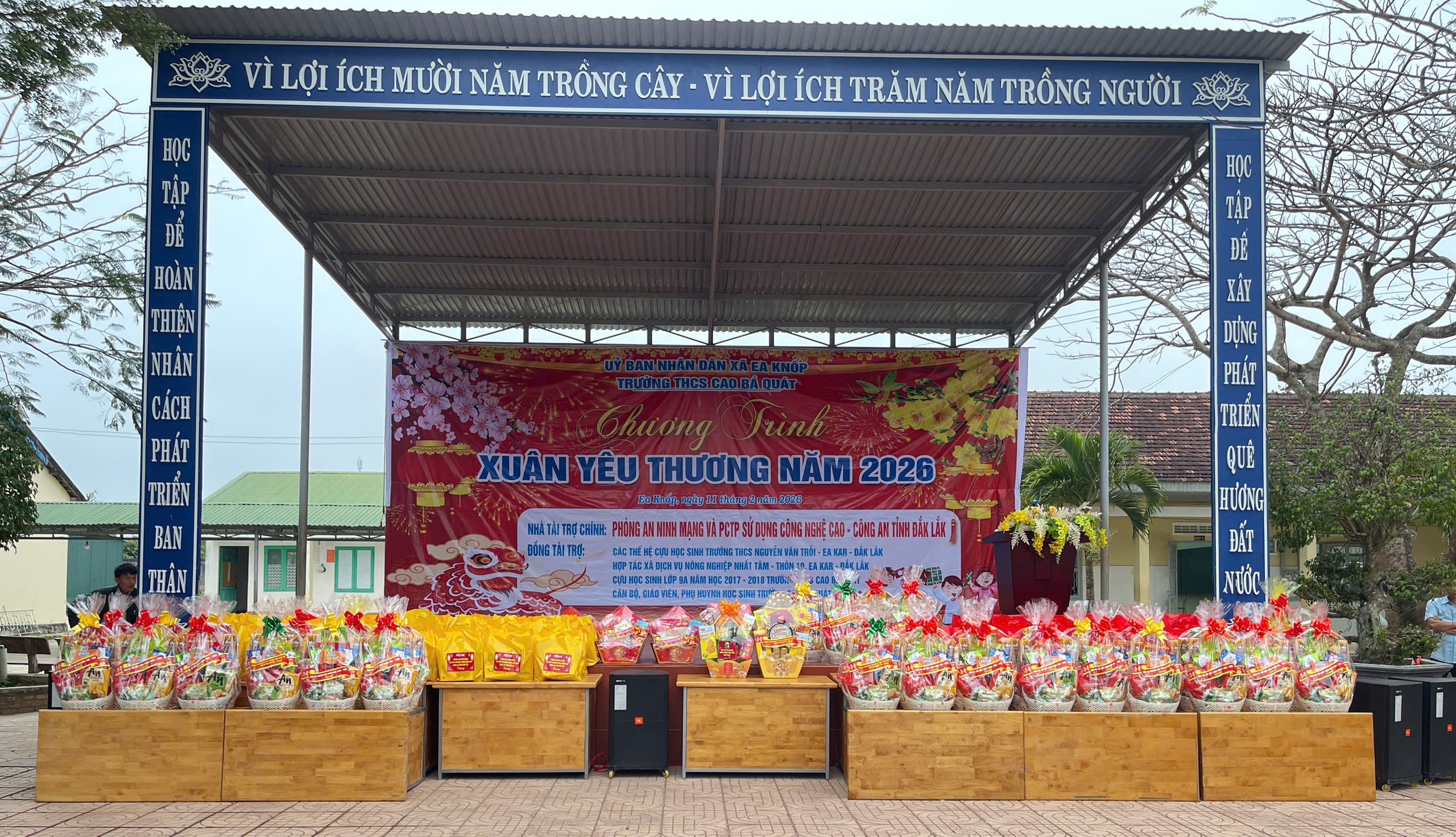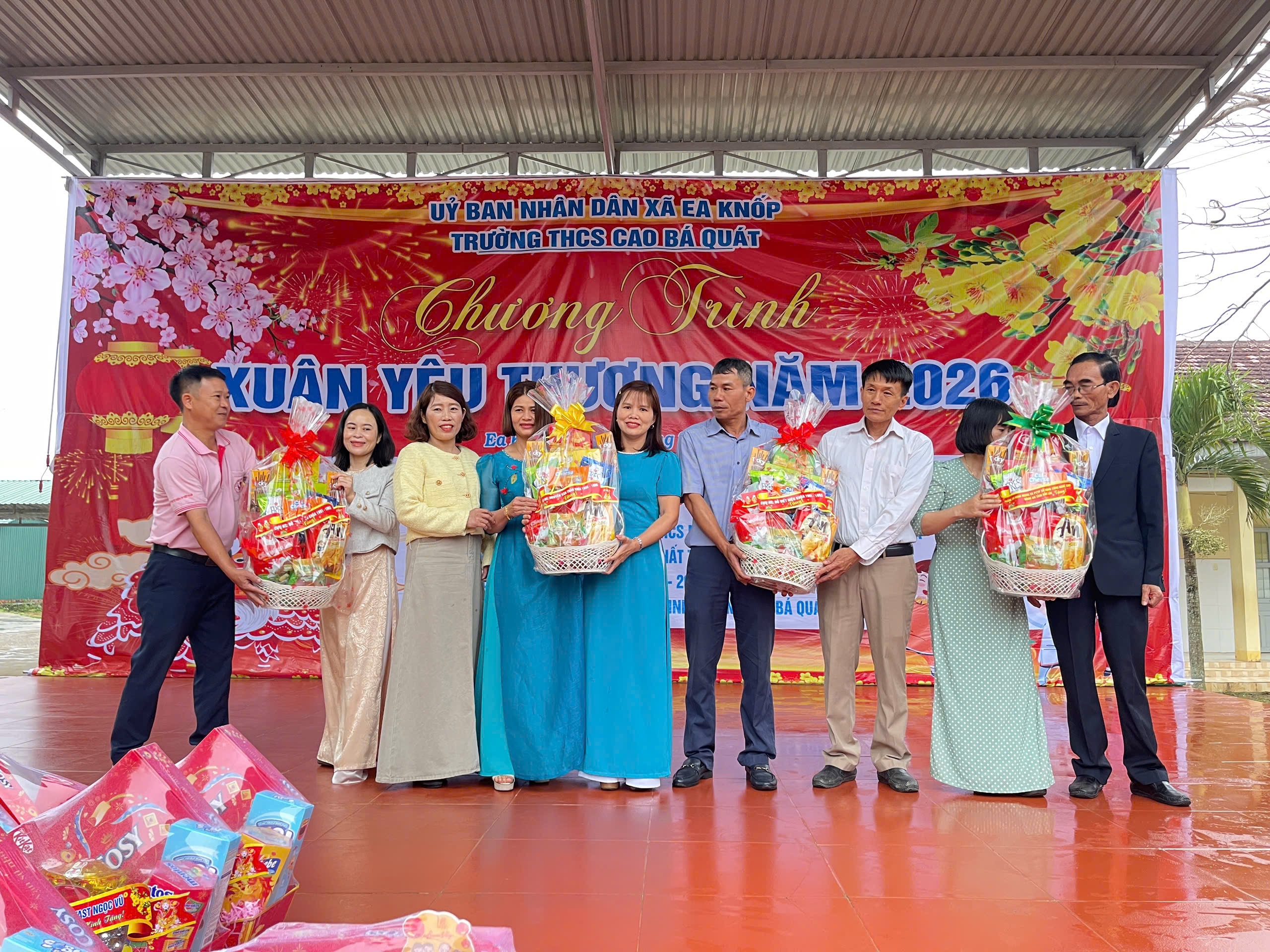 Sáng ngày 11/02/2026, trong tiết trời mưa nhẹ đầu xuân, Trường THCS Cao Bá Quát (xã Ea Knốp, tỉnh Đắk Lắk) đã tổ chức chương trình “Xuân Yêu Thương 2026” nhằm trao tặng quà Tết cho học sinh có hoàn cảnh khó khăn của nhà trường. Dù thời tiết không thuận lợi, nhưng không khí buổi lễ vẫn ấm áp, chan chứa nghĩa tình và sự sẻ chia.